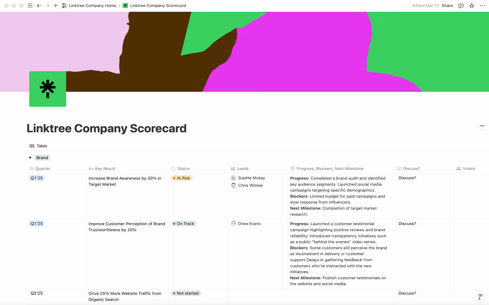 To bring structure to the chaos Linktree relies on its “scorecard” ritual, a streamlined take on the OKR process, managed entirely in Notion. More than just goal-setting, this system acts as a pulse check for progress, tracking key milestones, project timelines, and team accountability in a way that remains both structured and adaptable.