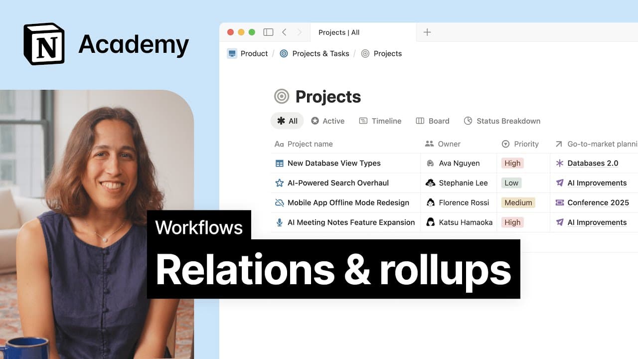 관계형 | 데이터베이스를 연결하고 데이터베이스 페이지를 멘션합니다. 워크스페이스 전반에 걸쳐 항목들을 연결할 때 유용합니다. 여기에서 자세히 알아보세요 → |